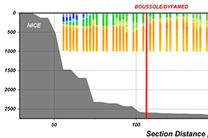 At first, the glider goes from Villefranche-sur-mer (French Riviera) to Calvi (Corsica), and back. During this transect, the glider operates between sea surface and 1000 meters water depth. The sensors are activated only during ascent. This “medium-resolution” transect allows to monitor, on a monthly basis, the main hydrographic and biogeochemical features of the Ligurian basin.
